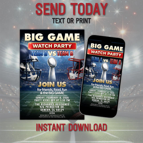 2026 LX football watch party mobile invitation | The Big Game text or print invite | game on, friends food and football