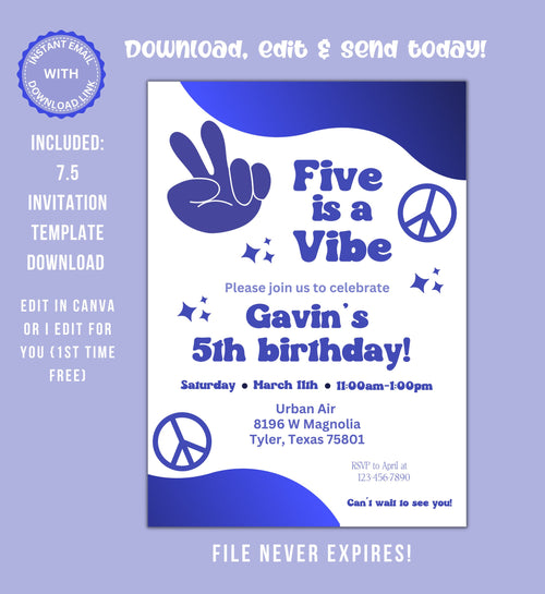 70s Navy Blue Birthday Invitation, Retro Five is a Vibe Digital Download